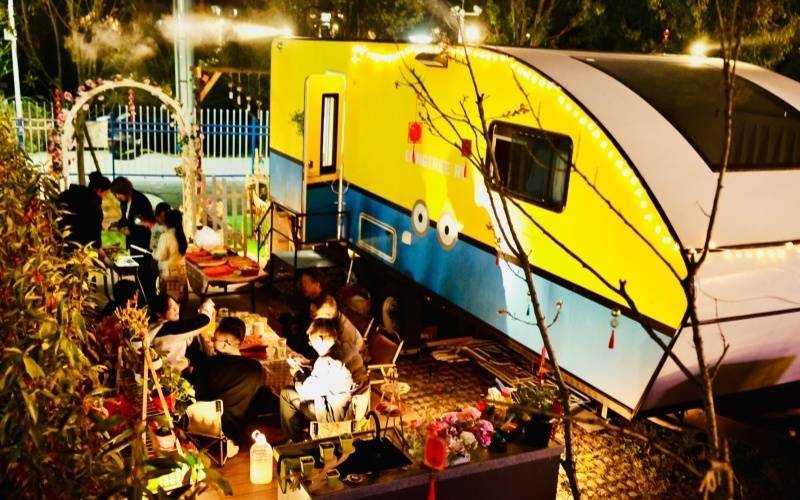 夜幕莅临,露营区灯光营造出虚耗的户外氛围,搭客们尽享失业乐趣。