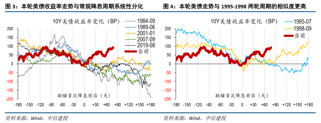 尤其是:1995-1998两轮周期中,10Y好意思债收益率在初次降息后,即运转筑底回升,抓续时辰在1-2个月,幅度分袂为56和91个bp(不接头更永劫辰的回升历程)。现在好意思债10Y收益率飞腾幅度为99个bp,相对更大,但总体特征和之前苟简相仿。