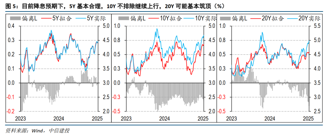 CME期货价钱来看,现在市集对年内降息预期次数仅剩1次阁下,互换市集的信号愈加悲不雅,2年内降息幅度可能仅1-2次,联邦基金利率较难向下冲破4%。按照这一降息预期进行拟合,现在弧线在5年这种中短端的点位相对合理(况且偏离幅度较低);10年期诚然高于预测值,但接头近两年的轻佻幅度,现在并不在极点水平,不扼杀连续上行20-30bp的可能性(这时达到轻佻的极限水平);而更始终限的20年这种,现在偏离幅度基本接近极限水平,超调的概率更大。